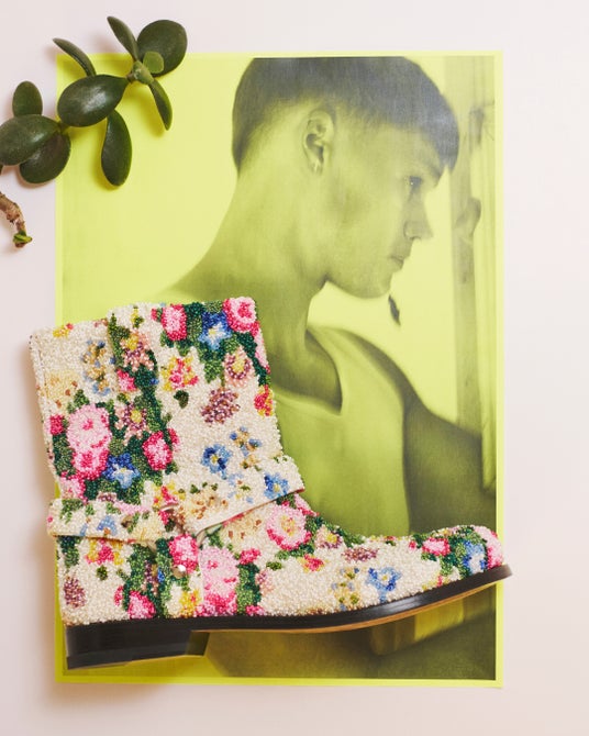 人物描写の率直な手法は、静物写真でも踏襲されています。刺繍が施されたスクイーズバッグ、柔らかなナパレザーのフラメンコパース、そしてカンポ バイカーブーツはまるでカタログ写真のように真上から撮影されています。それぞれのアイテムはデヴィッド・シムズのカラープリントの上に置かれ、まわりの石や植物などが謎めいた雰囲気を深めています。