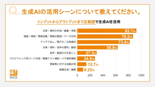 株式会社ラクス(本社:東京都渋谷区、代表取締役:中村 崇則、以下 ラクス)は、ラクスグループ正社員と契約社員を対象に、日々の業務における生成AIの活用実態調査を実施しました。
