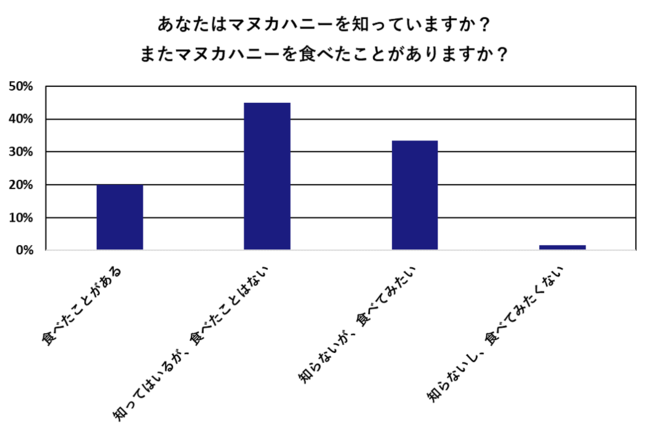 マヌカハニーを食べたことがあると約20%の人が答えた一方で、その倍以上の約45%の人が、知ってはいるが食べたことはないと答えました。