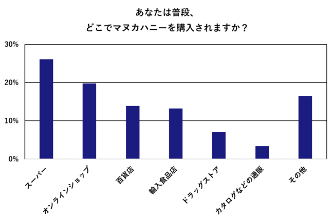 スーパーと答えた人が最も多く約26%。一方で、量販店ではあまり見かけない・取り扱っている種類が少ないという理由から、約20%の人がオンラインショップで購入していると答えました。ドラッグストアでの購入は約7%に留まりました。