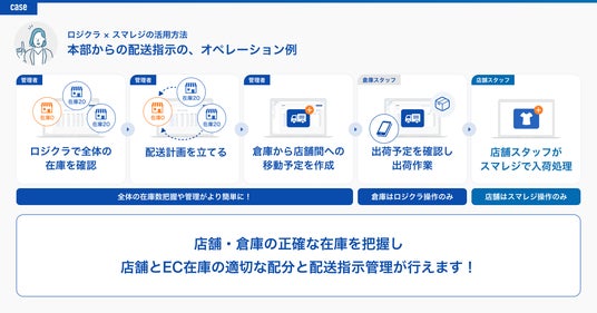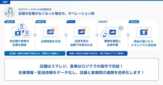 さらに、本連携を利用したオペレーションを構築することで、店舗スタッフはスマレジを、倉庫スタッフはロジクラを操作するだけで簡単に店舗・倉庫間の配送管理・効率化を実現することができます。