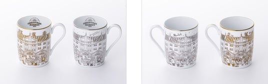 ノリタケブランドの特長でもある美しい白磁に、趣のある横浜赤レンガ倉庫と本イベントの賑わいを表現したデザインを施しています。クリスマスらしい金と銀の2色展開で、各色のデザインにも違いがあります。屋根の上の絵柄にご注目いただくと、金色のマグカップにはサンタたちが慌ててプレゼントを運んでいる様子が描かれ、銀色のマグカップには準備を完了させたサンタが夜空に飛び立っていく様子が描かれています。