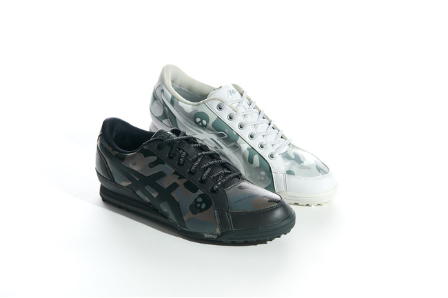 再販が決定した第2弾のコラボシューズは、ホワイトに加え、新たにブラックカラーが登場。レトロなデザインで人気のGEL-PRESHOT CLASSIC 3をベースに、マーク & ロナならではのオリジナル カモフラージュ グラフィックを全面にプリントしたモダンなデザインが特徴です。アッパー素材は、柔軟性に優れた極細繊維(マイクロファイバー)を使用した人工皮革を採用し、ソフトで快適な履き心地を実現。また、ミッドソールのかかと部分には衝撃緩衝性能に優れたGEL™ テクノロジーを内蔵。急斜面など力がかかる方向にグリップ力を発揮するように開発されたポイントソールが、スイング時の安定性を向上させます。