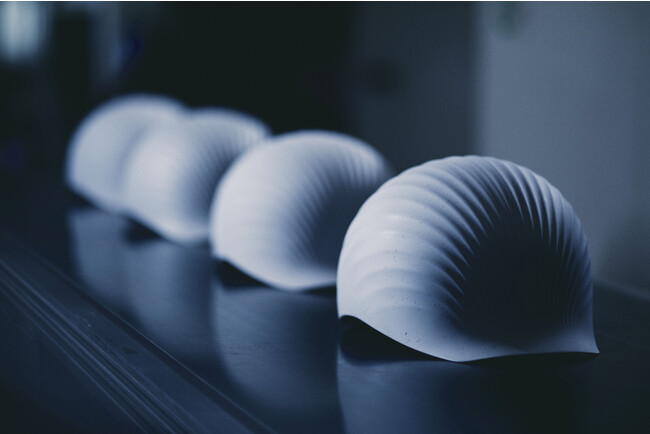 quantumは、本プロジェクトのプロダクトデザインを担当しています。HOTAMETの貝殻の様なフォルムは、自然界の仕組みを応用し、技術開発に活かすバイオミミクリーの考え方に基づき、ホタテ貝の構造を模倣した、特殊なリブ構造をデザインに取り入れています。その結果、少ない素材使用量でありながら、リブ構造が無い場合と比較して約30%も耐久性を向上させるなど、見た目の美しさはもちろん機能的にも考えられたデザインを実現しました。素材開発から設計に至るまで、環境への負担が少ない持続可能性に配慮したプロダクトとなっています。