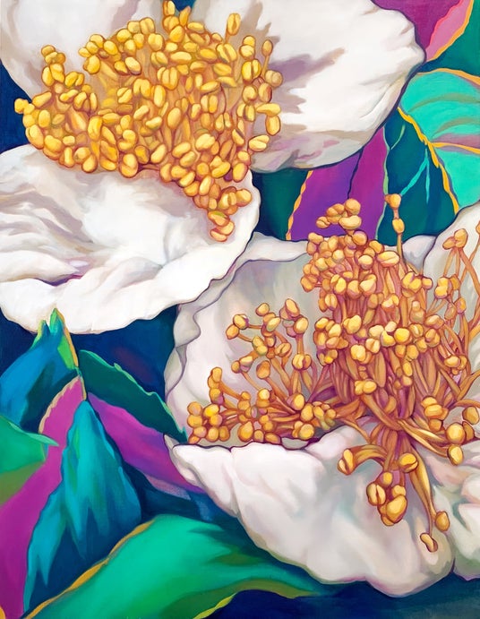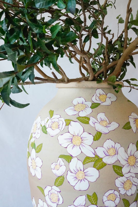 今回は、満開になってしまうとお茶の味や風味が落ちるために疎まれている、白く可憐なお茶の花にフォーカスし、本来植物が成長する過程で自然に生まれるものが、人の手によって強制的に排除されてしまう儚さに醜美を見出し、絵画とインスタレーションでお茶の花を表現しています。