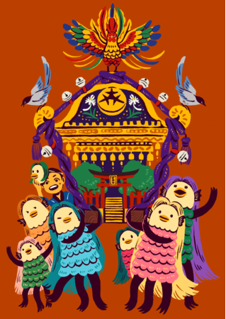 人々がまたマスク無しで生活が出来ますように、様々なイベントを心置きなく楽しめますように、疫病封じの妖怪であるアマビエを描きました。御神輿には世田谷の紋章とシンボル「オナガ」「ケヤキ」「サギソウ」を入れ込みました。
