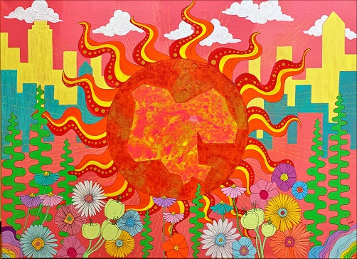 今回、仮囲いのデザインという事でしたので、人々を守るような物は何だろとうと考えた時に太陽が思い浮かびました。 太陽は世田谷区をイメージし、緑や花は人々をイメージして描きました。 太陽には人々を元気にする力、植物、生き物を育てる力があります。 そんな太陽の様に人々を元気にできる様な存在、新しい芽(新たな物事)を成長させていける様な存在になっていって欲しいと言う思いを込めて太陽の真ん中に世田谷区を描いています。 コロナ禍で何かと苦労の多い日々ですが、仮囲いの前を通った人が少しでも明るい気持ちになる様な色使いをさせて頂きました。
