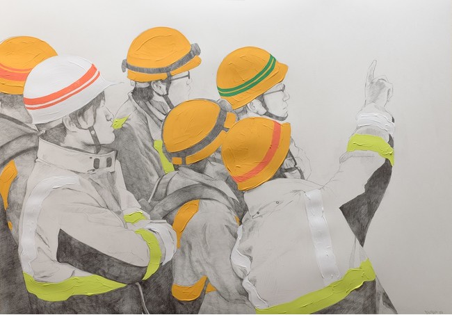 彼らはどこを指差しているのでしょうか。仮囲いの向こうには何がおきているのでしょうか。 私はスペイン・マドリードで生まれ育ちました。3年前、初めて東京に引越し、世田谷区で暮らし始めました。暮らし始めてすぐ目を引かれたことが1つあります。東京のさまざまな工事現場や空き地でした。周りの風景が日々変わっていくことで、街と空間の存在を実感し、そんな未完成なのに可能性に満ちた未来がこもった風景を私の様々な作品に取り入れてきました。そしてその奇跡を手と脳でおこす人間たちに、作家として力をもらっていました。そのパワーと希望が今回の作品を通して街の皆さんに届ければ嬉しいです。
