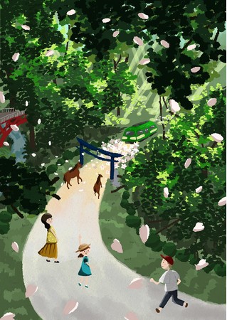 自然の豊かさが世田谷区の素敵なところだと思うので、みっちりした木々と舞い上がる桜の花びらを描きました。こもれびや電車が引く明るい道で「あっちの方に行ってみたいな」とついみんなが思ってしまうまちの魅力を表現できればと思っています。 建設現場は視覚的に無機質になりがちかと思うので、この絵を見てくださった方が緑豊か・光あふれる景色を想像して、自然の和みを感じていただけるととても嬉しいです。
