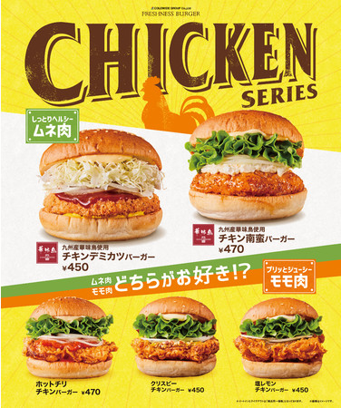 コロワイドグループの株式会社フレッシュネス(代表取締役社長:齋藤 健太朗/本社:神奈川県横浜市西区)は、2022年4月13日(水)より、ハンバーガーチェーン「フレッシュネスバーガー」にてムネ肉・モモ肉を使用した5種類のハンバーガーが楽しめるチキンシリーズキャンペーンを開催いたします。