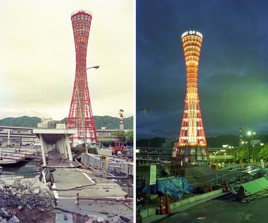 阪神・淡路大震災では、神戸港やメリケンパーク周辺にも甚大な被害が広がる中、ほぼ無傷で耐えて力強い姿を見せた神戸ポートタワー。