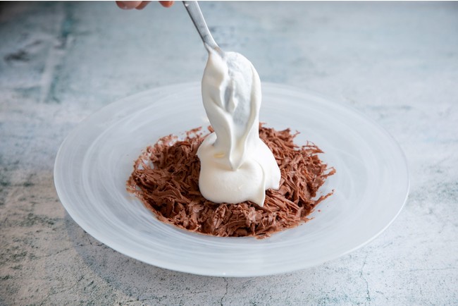 最後にビターチョコレートを削ることで、一口目からカカオ本来の香りも楽しんでいただくことができます。大人が最後まで食べたくなるビターな甘さに仕上げました。