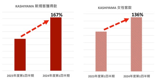 “オーダーメイドの民主化”を目指し、価格は33,000円(税込)からオーダーメイドスーツの商品を展開するKASHIYAMAは、若年層及び初めてオーダースーツを購入する顧客に向けた「学割」と「2buy20%OFF」のキャンペーンが好調で、新規客獲得数は2023年度比167%となりました。さらに、レディースシューズやレディース向けのカジュアルなスーツラインに注力をしたことから、女性のオフィススーツ需要にも対応することができ、女性客数も2023年度対比で136%を達成。スーツ市場として、若年層や女性、既製品ユーザーが、オーダーメイドスーツに移行していると考察することができます。