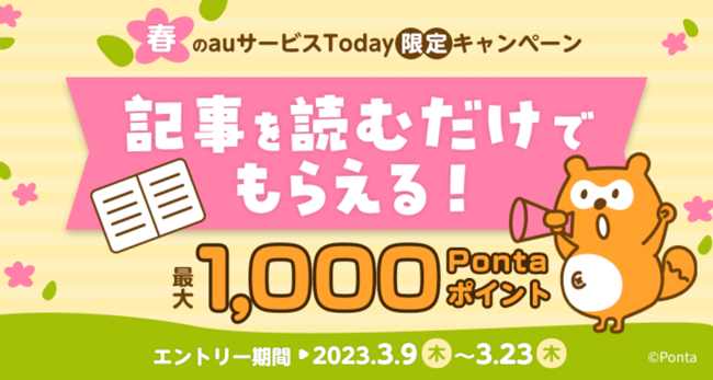 株式会社Gunosy(本社:東京都渋谷区、代表取締役社長:竹谷祐哉、以下 Gunosy)は、ポータルアプリ「auサービスToday」内で、「春のauサービスToday限定キャンペーン」を3月9日(木)10時00分~3月29日(水)23時59分の期間限定で開催いたします。auサービスTodayアプリでキャンペーンにエントリーし、期間中に1日1記事 合計7日間記事を読むだけで参加可能、抽選で最大1,000Pontaポイントが当たるお得なキャンペーンです。抽選で選ばれたユーザーには1,000Pontaポイントが加算される他、外れてしまったユーザーでも必ず10Pontaポイントが加算されます。