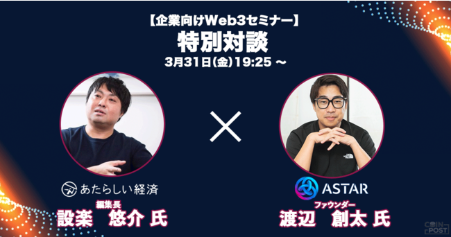 仮想通貨やブロックチェーンに関するニュースを専門に扱うオンラインメディア「CoinPost」を運営する株式会社CoinPost(本社:東京都荒川区、代表取締役CEO:各務 貴仁)は、3月31日(金)に「エンタメ・ゲーム業界におけるWeb3導入・活用事例」をメイントピックとするセミナーを開催いたします。本セミナー後のトークセッションに、日本発のパブリックブロックチェーン「Astar Network(アスターネットワーク)」のファウンダーでもあり、株式会社NTTドコモやソニーネットワークコミュニケーションズ株式会社などとWeb3の取り組みを進めているStartale Labs Pte Ltd.(以下、アスターネットワーク)創業者の渡辺創太氏をお呼びし、国内企業がどのようにWeb3と向き合うべきかなどについてお話しいただく予定です。