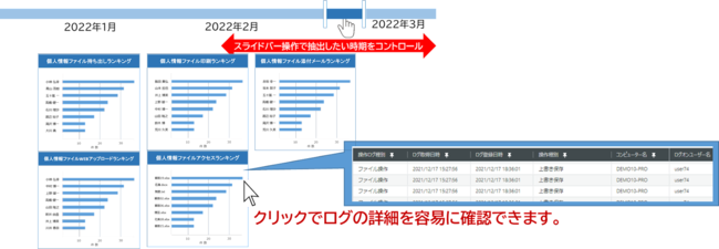 操作ログを収集するPC台数に関わらず最大7年間分のデータをクラウドに収集し、そのままの状態で保管ができ、そのすべてのログを対象に検索することが可能です。検索対象期間を動的に移動できる「セキュリティ」「ワークバランス」といったグラフィックなレポート表示で異常値の発見が容易です。ファイルの印刷、持ち出し、メール添付、アップロードの単位でランキング表示します。週単位でスライダーを移動させることによりランキング表示された棒グラフが変化します。スライダーの移動により、いつも登場しないユーザーによる操作が棒グラフが異常値として現れ、その操作の詳細を把握することが可能です。