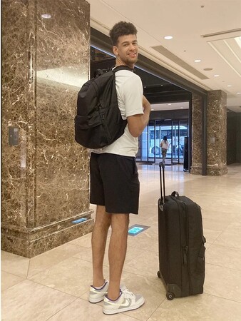 提供いただいたバックパックを着用するトレイ・ポーター選手(背負っている物)