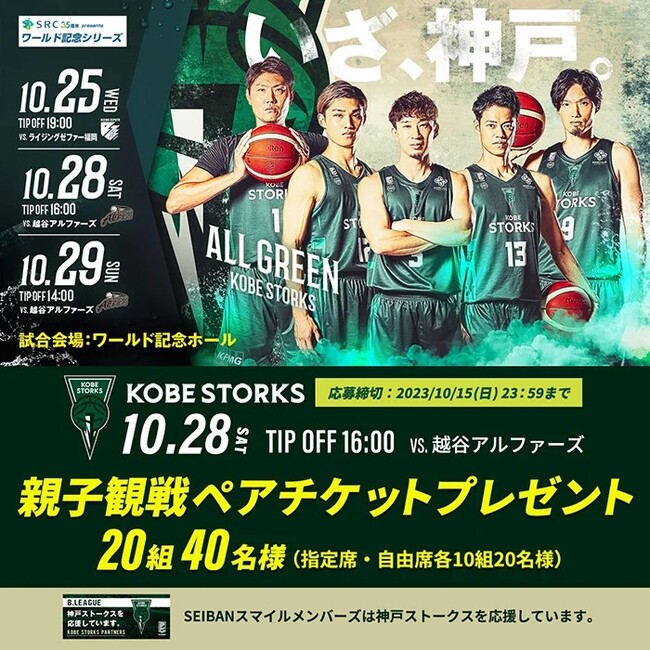 パートナー契約にあたり、セイバンが運営する「Soda!Soda!(探究子育てまなびメディア)」にてSEIBANスマイルメンバーズ限定の親子ペア20組さまを2023年10月28日(土)にワールド記念ホールで実施の観戦試合へご招待いたします。