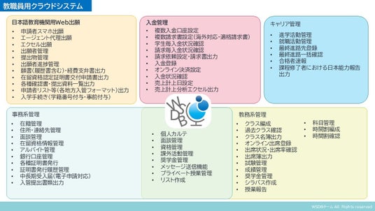 留学生の入学から卒業までを一括管理し、教職員用Webシステムと、学生用WSDBポートフォリオ(スマホアプリ)を利用することで、日本語教育機関の効率化と学生の学習環境をサポートします。