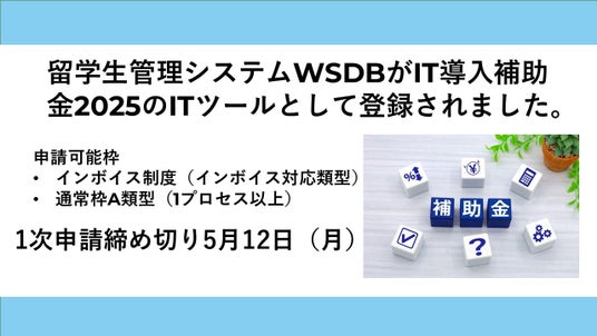 株式会社OneTerrace(本社:東京都千代田区、代表取締役 石中 達也、以下「弊社」)が販売し、東和ソリューションエンジニアリング株式会社(本社:東京都台東区、代表取締役 反町長禄、以下「TSE」)が開発する留学生管理システム「WSDB」が、独立行政法人中小企業基盤整備機構の採択するIT導入補助金2025(サービス等生産性向上IT導入支援事業費補助金)の補助金対象ツールとして登録されました。