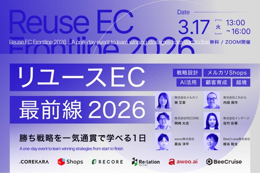 本セミナーでは、リユースEC支援のプロフェッショナルである株式会社これからが主催し、メルカリ、RECORE、インゲージ、awoo、BeeCruiseの6社が集結。集客、サイト設計、AI活用、顧客体験、そして海外展開まで、2026年にリユースECが勝ち続けるための「一気通貫の戦略」を徹底解説します。