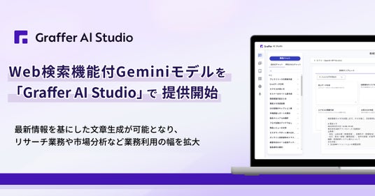 生成AI活用による企業変革を実現する株式会社グラファー(本社:東京都渋谷区、代表取締役:石井大地、以下「当社」)は、企業向け生成AI活用プラットフォーム「Graffer AI Studio」において、Web検索の機能を搭載したGeminiモデル(以下「検索付モデル」)の提供を開始しました。これにより、生成AIが苦手とされてきた最新情報を基にした文章生成が可能となり、リサーチ業務や市場分析など業務利用の幅を広げます。