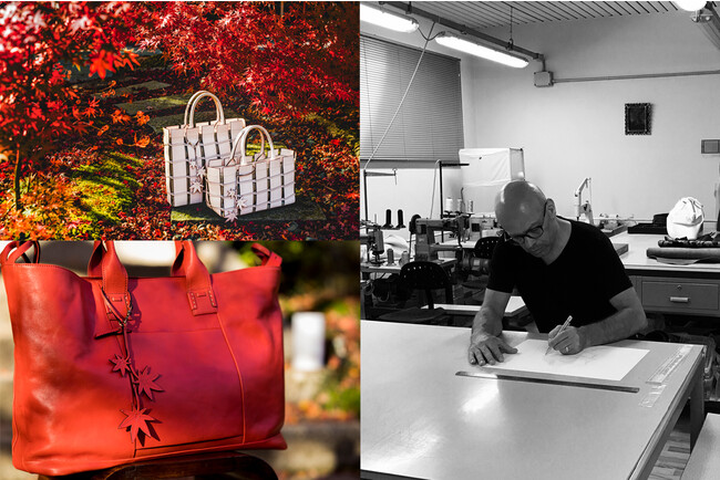 紅葉の鮮やかな朱色に、イタリアの国旗にもある「情熱の赤」を重ねた氏は、 イタリアに戻りタンニン鞣し革で「京都の赤」を再現。 頑なまでに自身の手によるクラフトワークにこだわる職人気質なマエストロが、京都の感動をイタリアの技術と素材とを用いて形にしたリュクスなバッグは ミラノコレクションでも大好評を得ました。