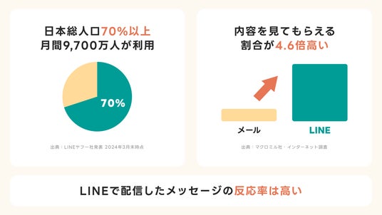 コミュニケーションアプリ「LINE」は現在月間9,700万人のアクティブユーザーを有し、日本総人口の70%以上が活用しているアプリです。LINEの開封率はメールと比べて4.6倍高く(※1)、LINE公式アカウントに友だち登録をしたユーザーの57%はクーポン/キャンペーンを利用した(※2)と回答しています。
