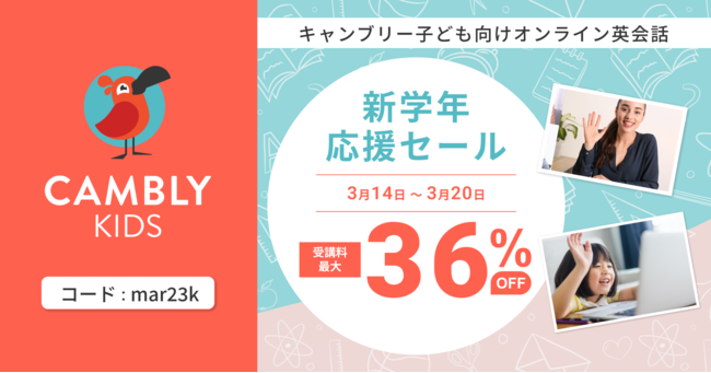 Cambly Inc.(本社:アメリカ・サンフランシスコ、日本代表:佐藤 亜希子)が提供する子ども向けオンライン英会話サービス「Cambly Kids(キャンブリー キッズ)」は、新学年に向けた英語学習を応援するセールを開催します。セール期間中は、Cambly Kidsの英会話レッスンを最大36%オフでご利用いただけます。