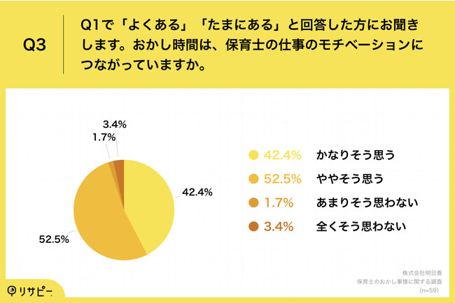 Q1で「よくある」「たまにある」と回答した方に、「Q3.おかし時間は、保育士の仕事のモチベーションにつながっていますか。」(n=59)と質問したところ、「かなりそう思う」が42.4%、「ややそう思う」が52.5%という回答となりました。