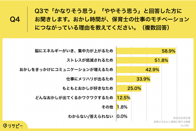 Q3で「かなりそう思う」「ややそう思う」と回答した方に、「Q4.おかし時間が、保育士の仕事のモチベーションにつながっている理由を教えてください。(複数回答)」(n=56)と質問したところ、「脳にエネルギーがいき、集中力が上がるため」が58.9%、「ストレスが低減されるため」が51.8%、「おかしをきっかけにコミュニケーションが増えるため」が42.9%という回答となりました。