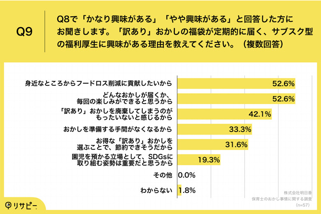 Q8で「かなり興味がある」「やや興味がある」と回答した方に、「Q9.「訳あり」おかしの福袋が定期的に届く、サブスク型の福利厚生に興味がある理由を教えてください。(複数回答)」(n=57)と質問したところ、「身近なところからフードロス削減に貢献したいから」が52.6%、「どんなおかしが届くか、毎回の楽しみができると思うから」が52.6%、「「訳あり」おかしを廃棄してしまうのがもったいないと感じるから」が42.1%という回答となりました。