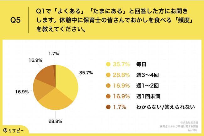Q1で「よくある」「たまにある」と回答した方に、「Q5.休憩中に保育士の皆さんでおかしを食べる「頻度」を教えてください。」(n=59)と質問したところ、「毎日」が35.7%、「週3~4回」が28.8%という回答となりました。