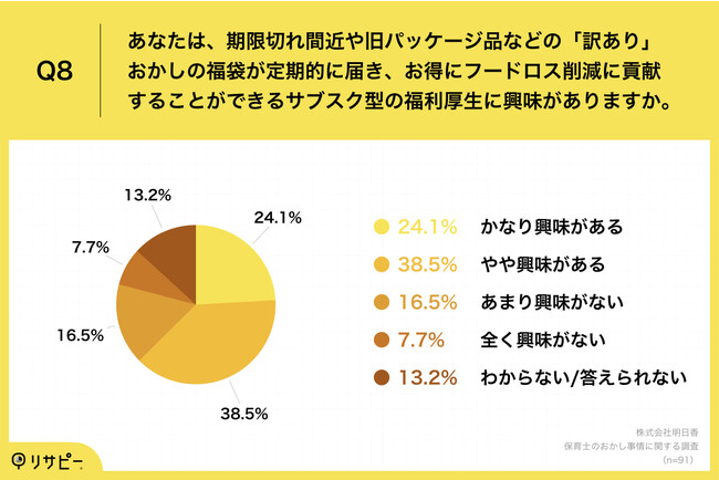 「Q8.あなたは、期限切れ間近や旧パッケージ品などの「訳あり」おかしの福袋が定期的に届き、お得にフードロス削減に貢献することができるサブスク型の福利厚生に興味がありますか。」(n=91)と質問したところ、「かなり興味がある」が24.1%、「やや興味がある」が38.5%という回答となりました。
