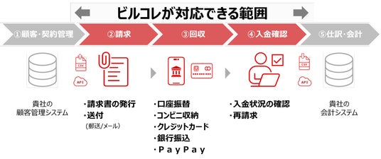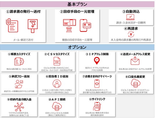 【基本プラン】1.請求書の発行~送付/2.回収手段の一元管理/3.自動消込/4.再請求 【オプション】1.帳票カスタマイズ/2.CSVカスタマイズ/3.IPアドレス制限/4.送信メールアドレス変更/5.承認フロー追加/6.担当者ID追加/7.お客さま向けマイページ/8.口座名義変更/9.収納代金分割入金/10.API接続/11.サイトリンク