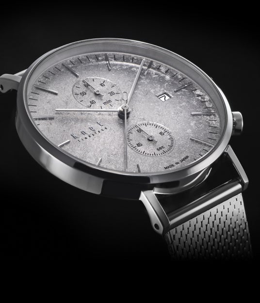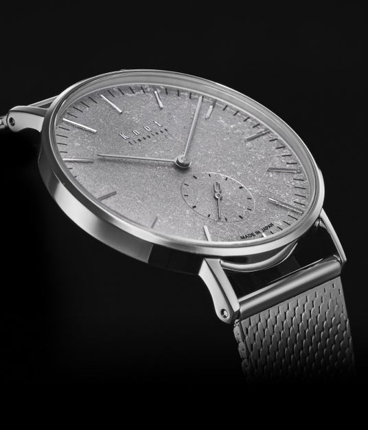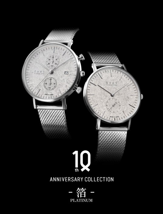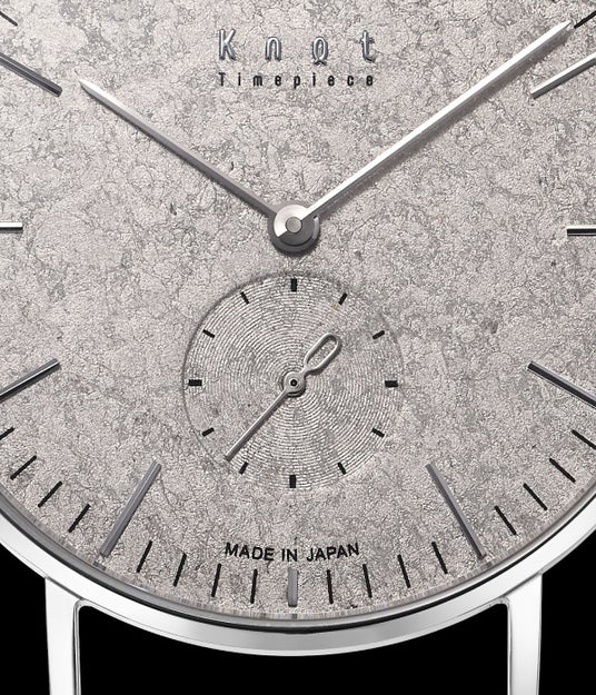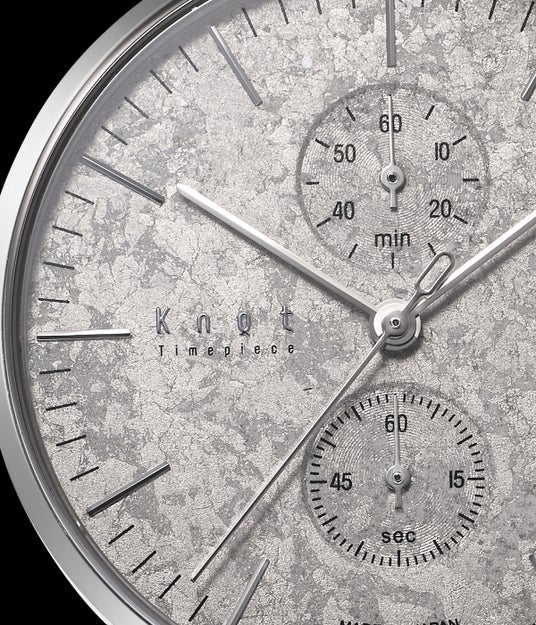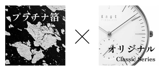 Knotの創業モデル「クラシックシリーズ スモールセコンド」、「クラシックシリーズ クロノグラフ」にプラチナ箔を施した、伝統工芸とKnotのオリジナリティが掛け合わったデザイン。金沢箔の第一人者、箔一の職人が手掛ける文字板は、時計に高級感を与えます。