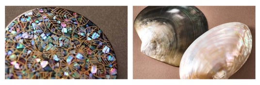 螺鈿の「螺」は、螺旋状の殻を持つ巻き貝を表し、「鈿」には飾るという意味があります。螺鈿細工とは貝の内側の輝く部分を薄く加工し、漆の表面に散りばめた美しい装飾方法。奈良時代に中国から持ち込まれ、平安時代に発展し現代まで受け継がれる日本の代表的な伝統工芸です。