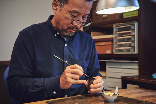 会津塗伝統工芸士。「伝統工芸士」とは、伝統的工芸品の製造に従事している技術者の中から、高度な技術・技法を保持する技術者だけに与えられる称号です。