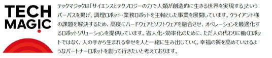 テックマジックは、2018年2月に設立。「サイエンスとテクノロジーの力で人類が創造的に生きる世界を実現する」をパーパスに掲げ、食を取り巻く多くの企業が直面する人手不足を解消し、人がより付加価値の高い業務に従事し、生産性の高い社会を実現するために、最新のAIやロボット技術を高度に融合した各種プロダクトの企画、設計、販売、保守を行っています。