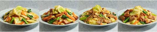 ▲写真左から:「野菜炒め」(税込538円)/「野菜炒め チャーシュー入り」(税込646円)「野菜炒め 牛もつ入り」(税込754円)/「野菜炒め ネギ塩豚タン入り」(税込754円)