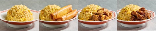 ▲写真左から:「たまごチャーハン」(税込538 円)/「たまごチャーハン 春巻き2 個のせ」(税込646 円)「たまごチャーハン 牛もつのせ」(税込862 円)/「たまごチャーハン 豚ハラミのせ」(税込862 円)