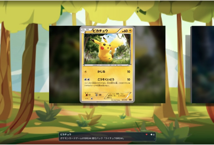 それぞれのエリアには、さまざまなポケモンカードが展示されています。鑑賞したいカードを選択すると、カードイラストがクローズアップされ、大きな画面でイラスト鑑賞をお楽しみいただけます。