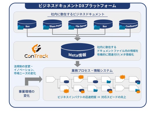「ConTrack」は、企業内に散在するビジネスドキュメントをメタデータ化し、「ConTrack」上で一元管理することで、誰もが必要な情報に迅速かつ的確にアクセスできる環境を提供します。また、散在しているビジネスドキュメント間をひも付けるだけでなく、経緯や根拠などの関連情報と有機的に結合させることで、組織全体のナレッジ活用が可能となります。