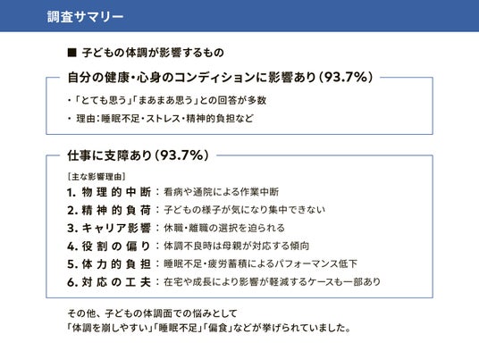 突発的な欠勤・業務中断、昇進・評価へ影響があるのではないかという不安、家庭内の人間関係や育児・教育への負荷、出産・育児によるキャリア形成への負担など、子どもの体調不良によって起こり得る家庭への影響は様々です。エニママの調査では93.7%の働くママが「子どもの体調不良で業務に支障をきたす」と回答しました。働くママたちのリアルな声から見えてきたのは、「子どもの体調不良が、ママ自身の心身や仕事にまで深刻な影響を及ぼしている」という現実でした。突発的な欠勤、睡眠不足、精神的な不安など日々の小さな不調が、いつのまにか家庭全体のコンディションに波紋のように広がっていきます。
