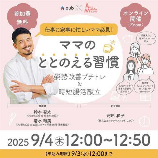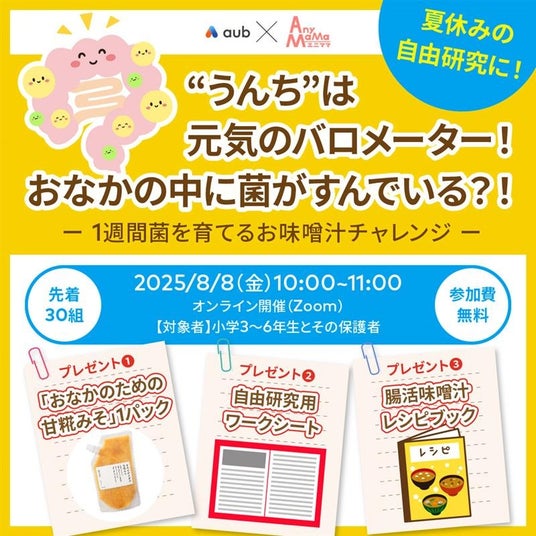 そして、AuBとエニママは「家族で取り組む腸活」をテーマに、夏休みの期間を活かしたウェルネスプログラムを実施します。親子で楽しく学べる「自由研究にも活用できるプログラム」と、ママ自身が日常的にコンディショニングの知識を育てるための「オンライン講座」の2本立てです。お子さまと一緒に"うんち"や腸内環境を観察することで、自分自身で体調変化のサインに気づく力を育てます。そして、ママ自身も「なんとなく不調」を言語化・可視化し、自分にあったコンディションを整えるヒントを得ることができます。 無理なく、楽しく、家庭の中から心と体を整えていく、そういった 両社は、"ママが最良のコンディションで過ごす毎日"を実現するための取り組みを開始します。