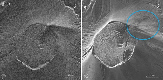 左:QPS-SAR10号機による6月27日の試験観測画像[※5](2025年6月27日 19時00分) 右:QPS-SAR9号機による7月3日噴火後の緊急観測画像(2025年7月3日 23時30分)