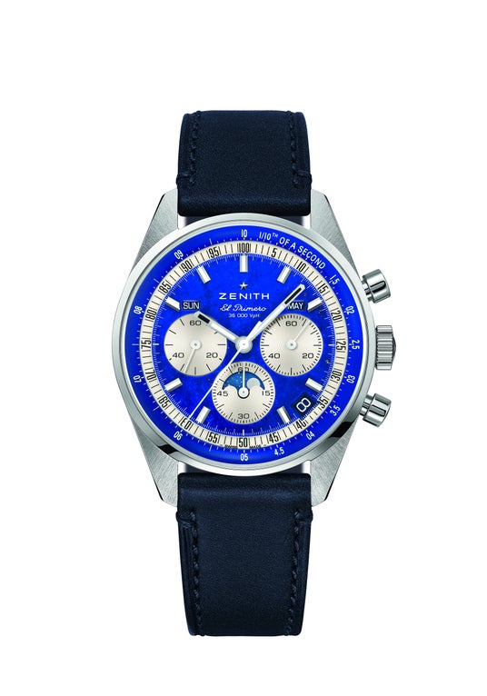 特長:1/10秒の計測と表示が可能な自動巻コラムホイール エル・プリメロ クロノグラフ。コンプリートカレンダー(曜日、日付、月)。ムーンフェイズ表示。パワーリザーブ 60時間。秒針停止機構。ラピスラズリ文字盤。