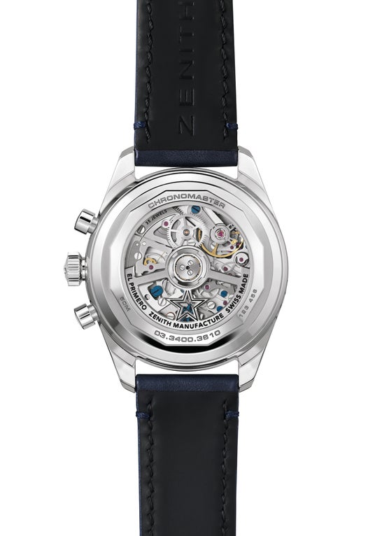 サファイアガラスのシースルーの裏蓋からは、印象的なブルーのコラムホイールや、ゼニススターがあしらわれたオープンローターなど、ムーブメントの緻密な構造を見ることができます。