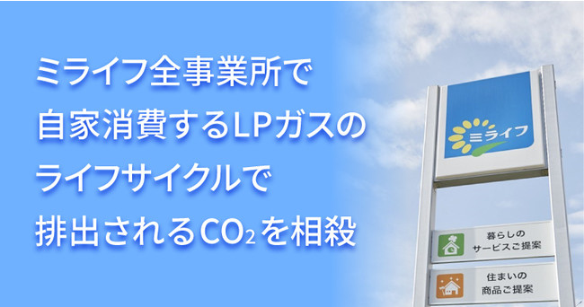 このたびミライフが採用したのは、民間団体が削減効果を評価するボランタリークレジットを採用した、ENEOSグローブ株式会社が提供する「カーボンニュートラルLPG」です。ミライフが事業を展開する全拠点に採用することで、事業所で自家消費されるLPガスのライフサイクルから排出されるCO2を実質ゼロにします。