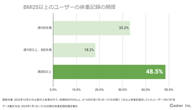 2023年1月の、肥満傾向にあるユーザーの体重記録の頻度を見てみると、約半数の方が週3回以上、体重を記録していました。